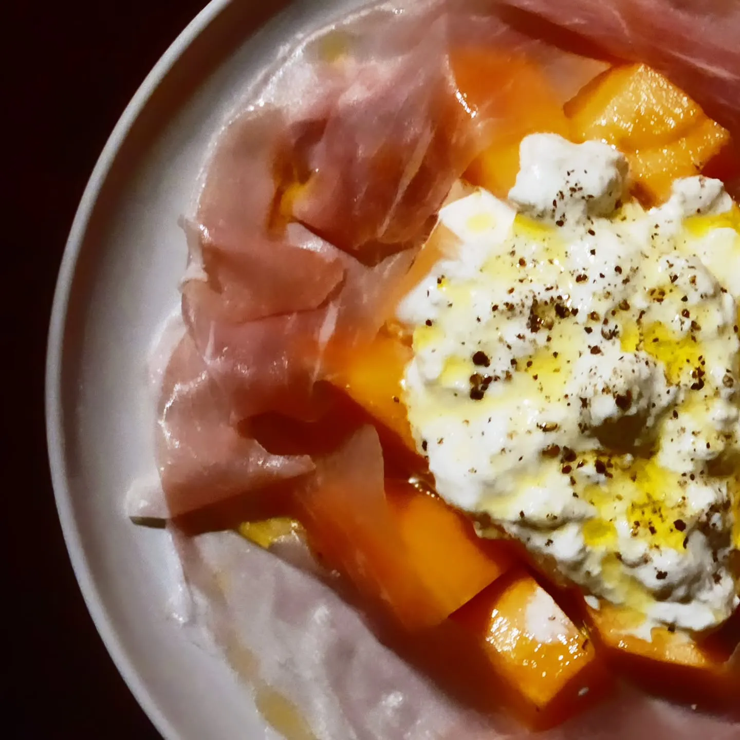 『生ハムメロンとフレッシュチーズ』 2025/05/25 『生ハムメロンとフレッシュチーズ』 🍈が美味しくなってきました。 生ハムメロンとストラッチャテッラ。 美味しいです。 そろそろブッラータもしたいなぁ。 #鹿児島ディナー#天文館ディナー#ナチュラルワインが飲める店#鹿児島ナチュラルワイン#生ハムメロン#ストラッチャテッラ