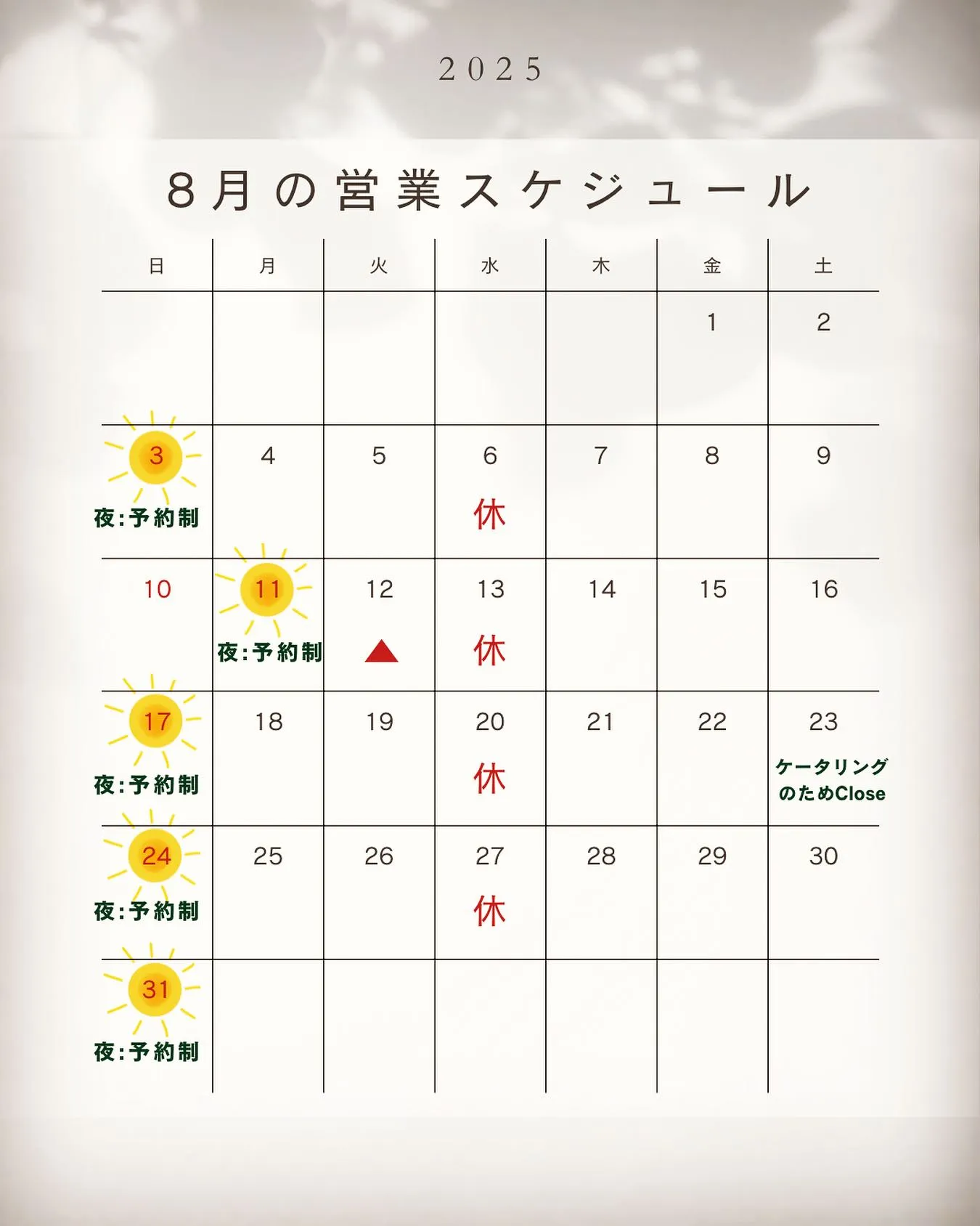 *▲・・・12日はご予約があれば営業!